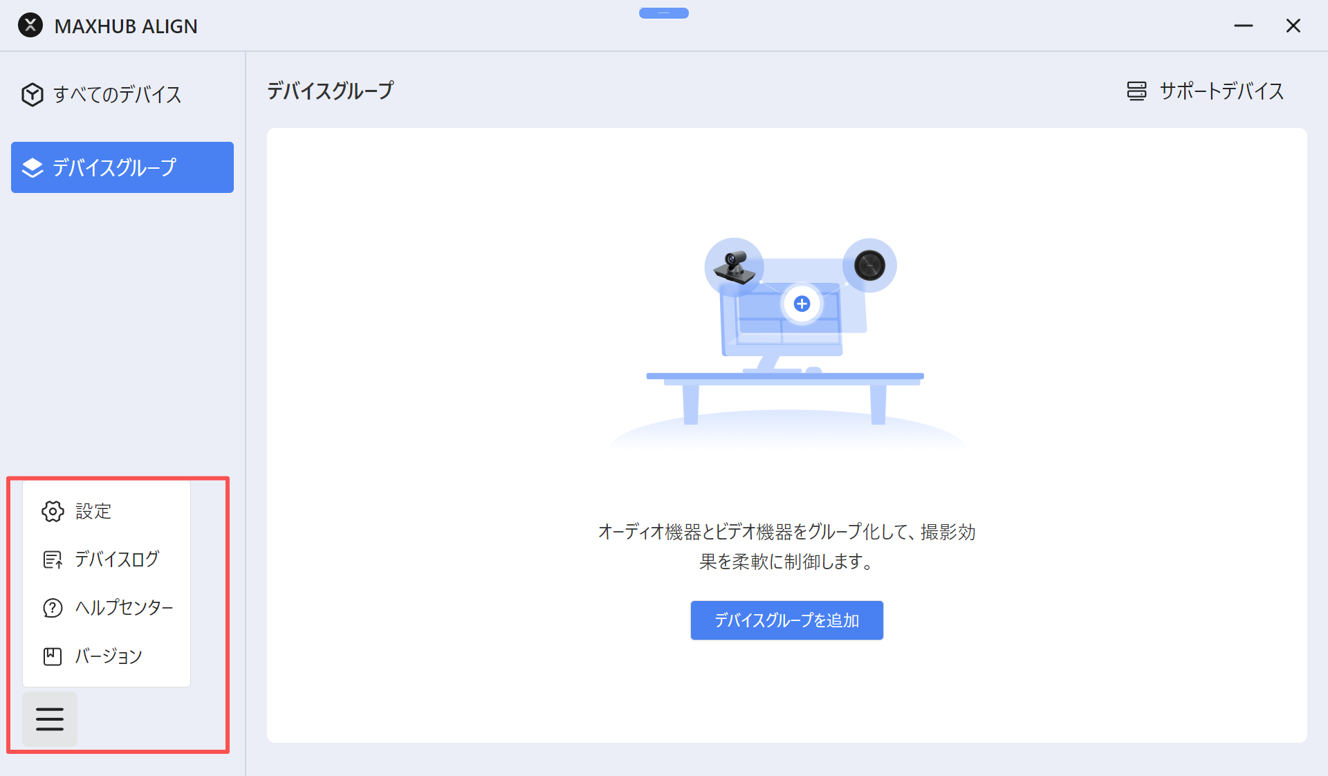 1.メニューアイコン(三本線)をクリックすると、言語設定やデバイスログの取得が可能です。
