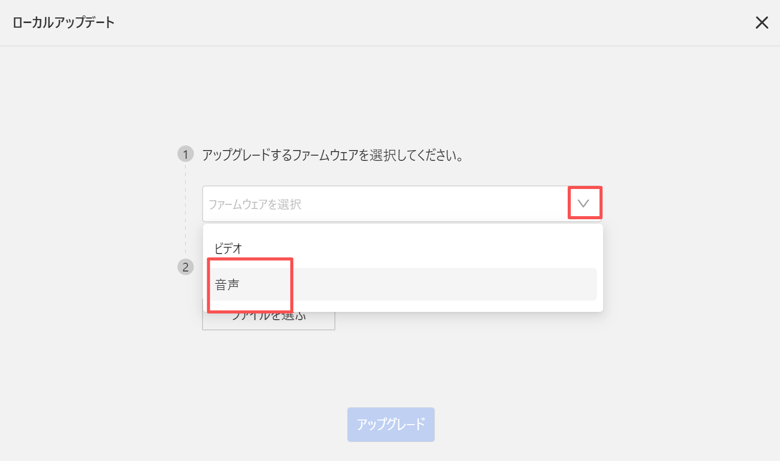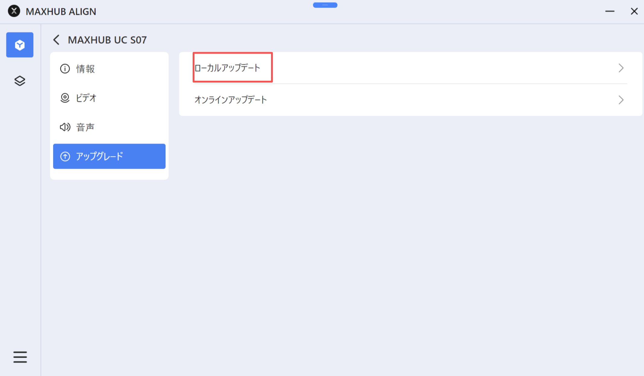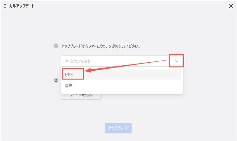 2.メニューから「アップグレード」を選び、「ローカルアップグレード」をクリックします。