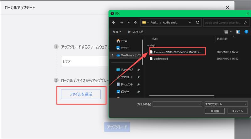 3.ビデオを選択し、展開したフォルダのCamera---V100-20250402-231658.binを選んで「開く」をクリックします。