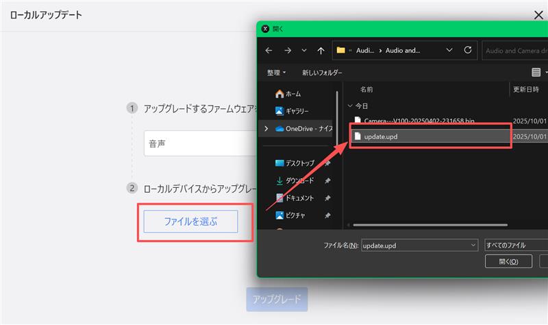 3.「音声」を選択し、展開したフォルダのupdate.updファイルを選んで「開く」をクリックします。