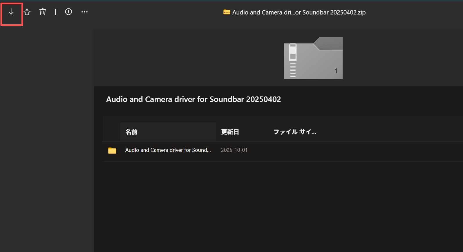 2.をクリックし、Audio and Camera driver for Soundbar 20250402.zipをダウンロードします。