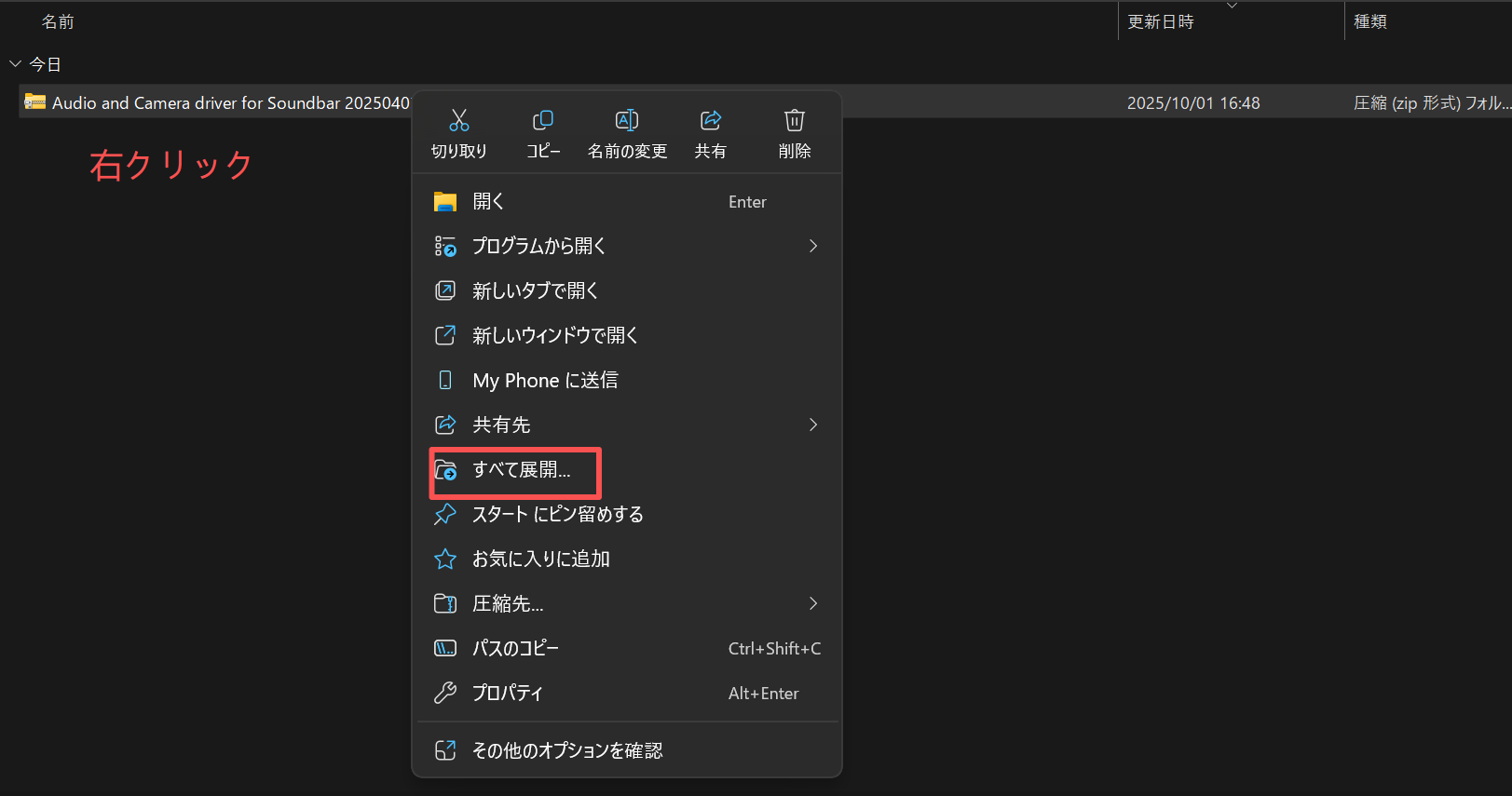 3.ダウンロードしたファイルを右クリックし、「すべて展開」を選択します。