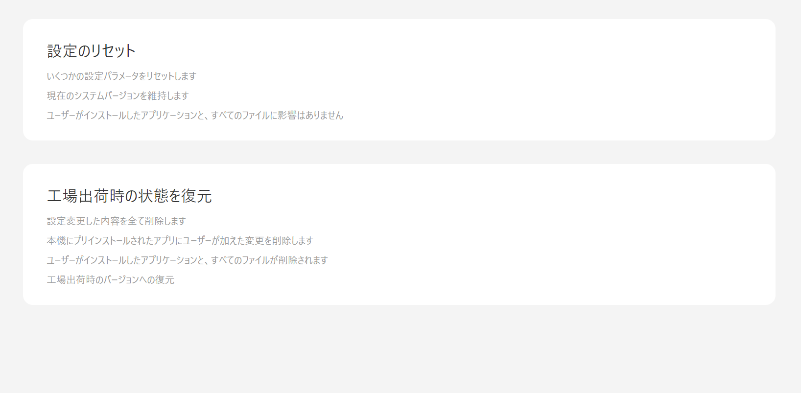 設定のリセット本機に関連する設定のみがリセットされます。保存されたデータは残ります。再起動後、初期設定が開始されます。工場出荷時の状態を復元工場出荷時の状態に本機がリセットされます。本機に保存されたデータや設定などはすべて消えます。