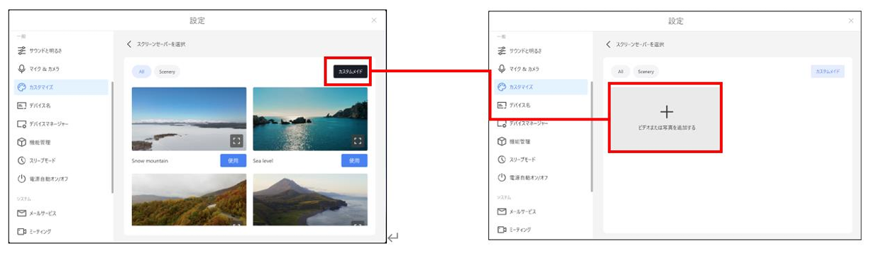 スクリーンセーバーをプリセットから選択(ダウンロードが始まります)または、本機に保存されている動画、写真を選択することができます。