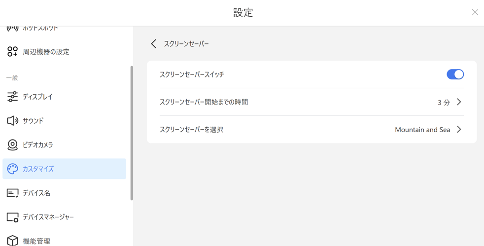 ONにするとスクリーンセーバーが有効になります。ホーム画面で規定時間以上経過するとスクリーンセーバーが再生されます。