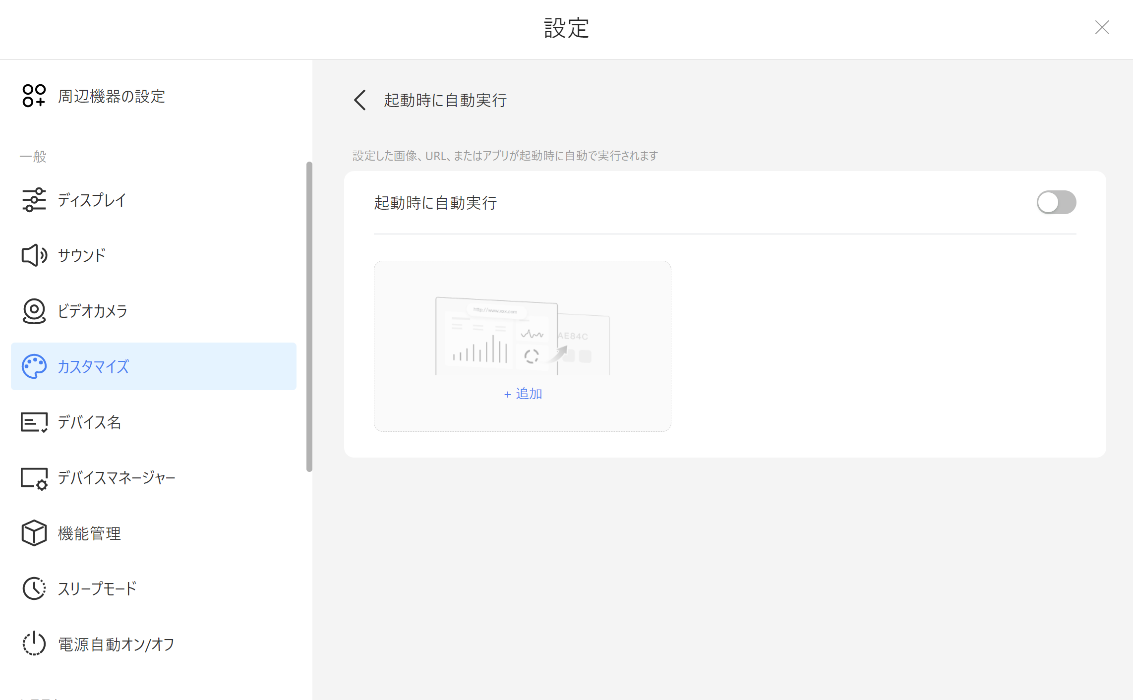 設定した画像、URL、またはアプリを本体の起動時に自動で実行します。