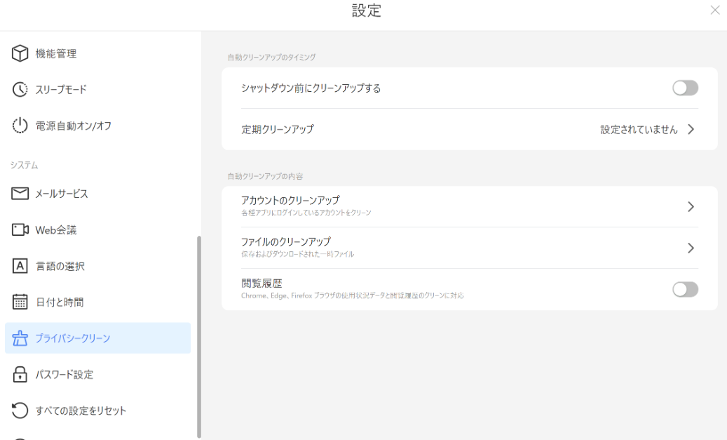 ON にすると、シャットダウン時に「自動クリーンアップの内容」に合わせてクリーンアップを実行します。