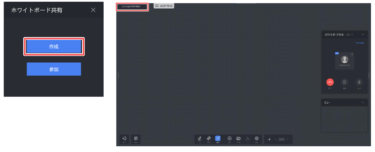 2)ホワイトボード共有が開始したら、画面左上に表示される8桁の参加コードを参加者に共有してください。