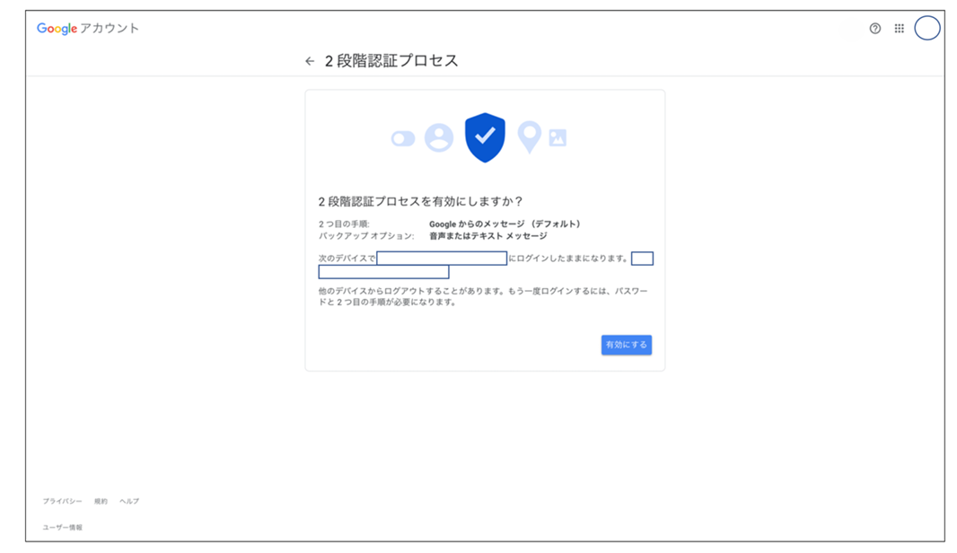 1) Googleアカウントメニューからアカウントページにアクセスします。 セキュリティ項目から「2段階認証プロセス」をクリック。