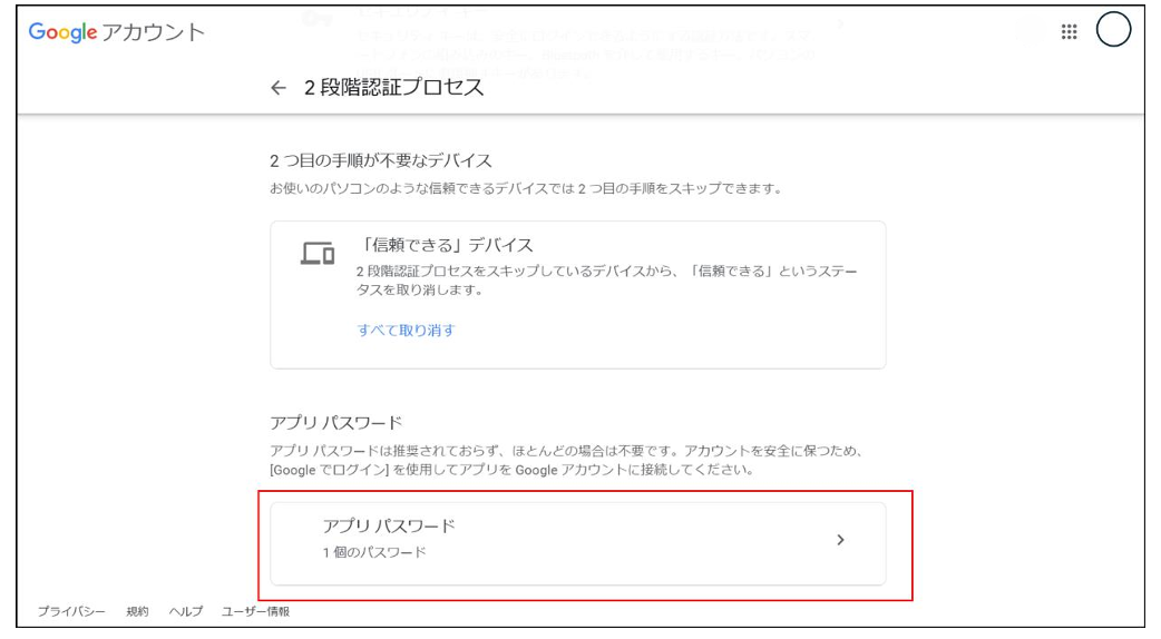 6) 2段階認証プロセスから「アプリパスワード」をクリック。
