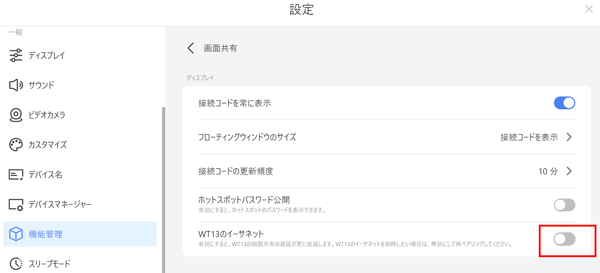 機能管理>画面共有>WT13のイーサーネット をオフにします。