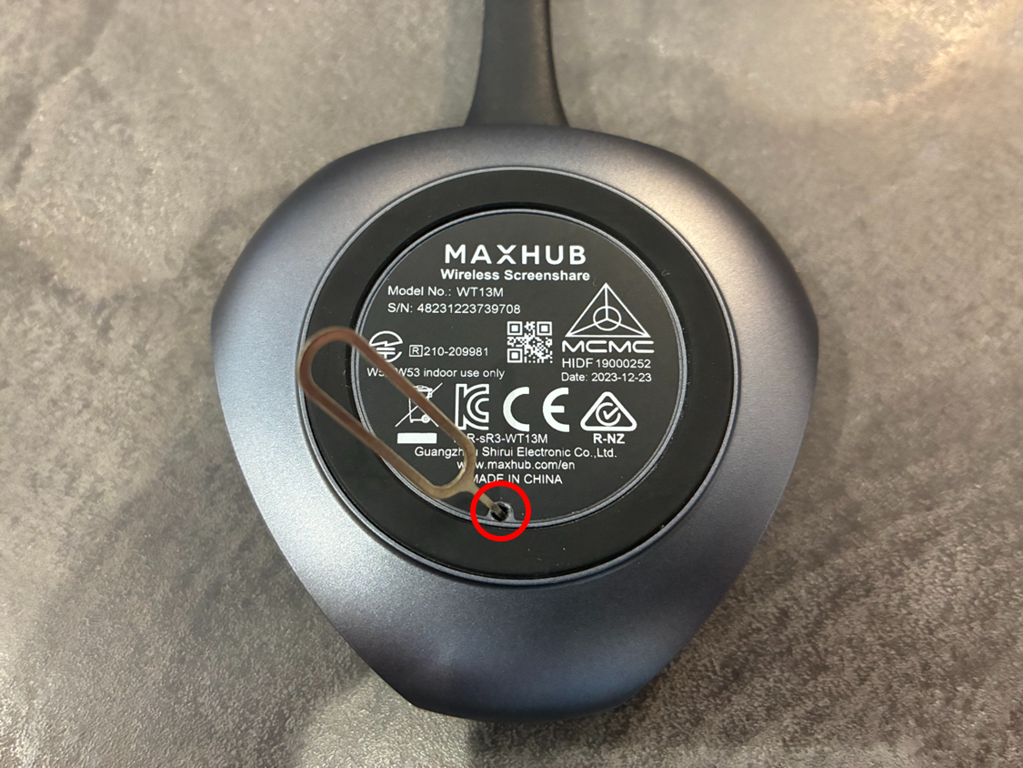 ドングルの背面のリセット穴にクリップなどの細長いものを挿し込み、10秒ほどリセットボタンを押し続けてください。(1cmほどの深さがあります。LEDの発光やリセット音などはありません。)
