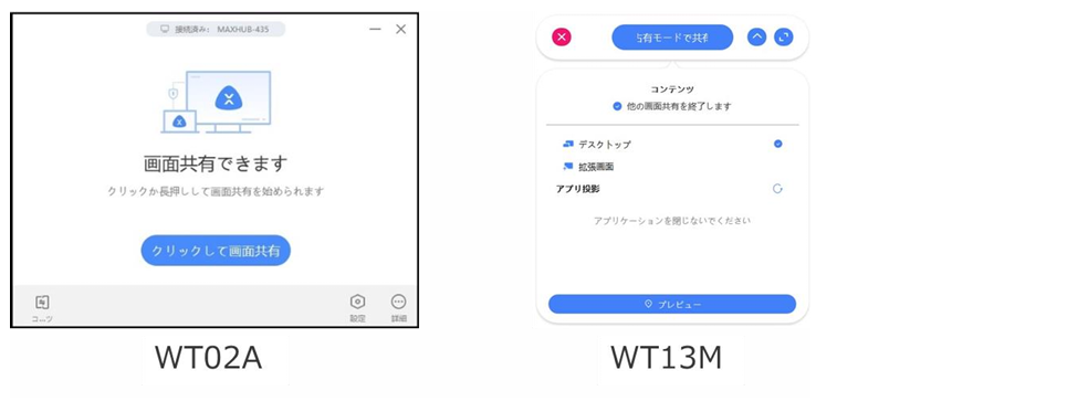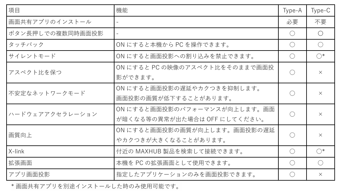 ワイヤレスドングルまたは専用アプリケーション(以下MAXHUB Share)を使用して、PC・タブレット・スマートフォン の画面を表示できます。本機上での操作は、画面投影された端末へ反映されます。(PCのみ)