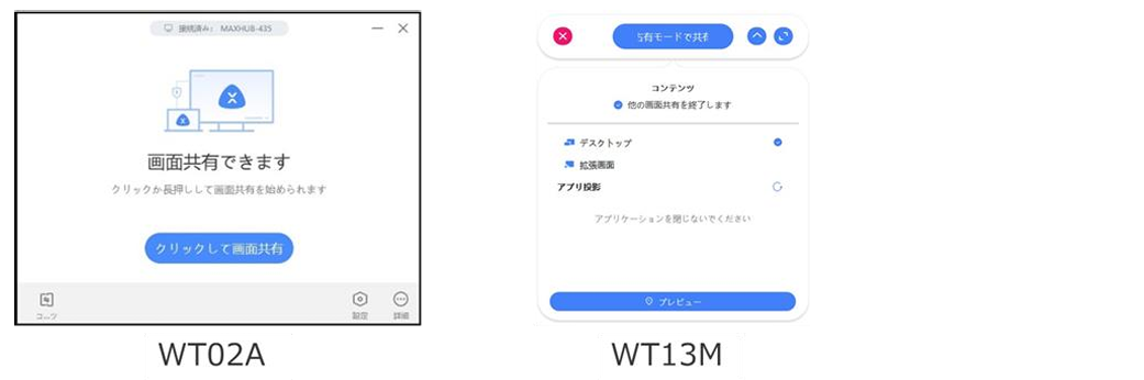 画面共有アプリが起動した後は下図のように表示され、ワイヤレスドングルのランプが点滅から点灯に変わります。 この状態でワイヤレスドングルのボタンを押すと画面投影が開始します。