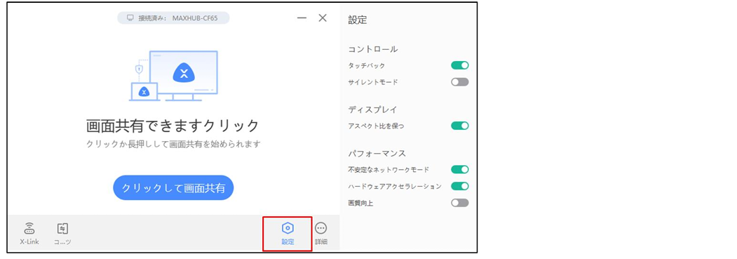 画面共有アプリでは各種設定やX-link、拡張画面等の機能が使えます。