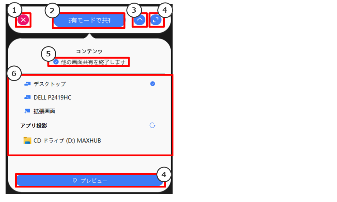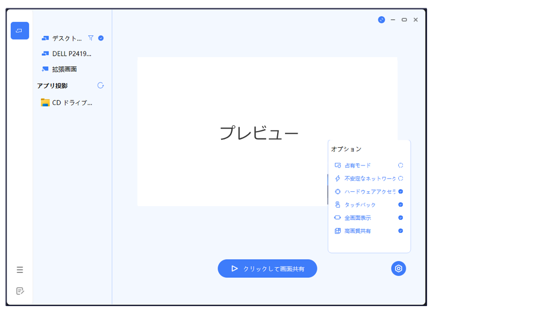 画面共有アプリでは画面投影する時の設定や、画面投影するコンテンツの選択ができます。