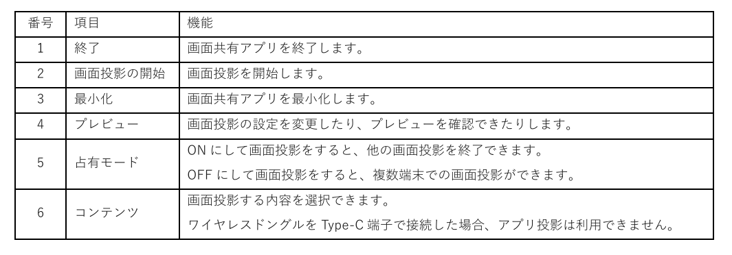 ・ ボタンを1回押す…ワイヤレスドングルのランプ点灯時、1台の端末の画面投影を開始します。再度押すと画面投影を 終了できます。