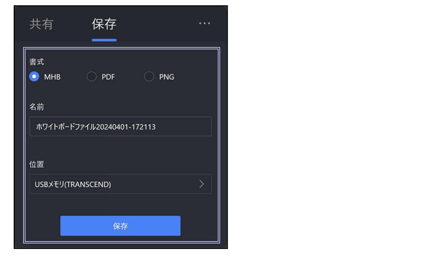 「MHB」はMAXHUBのホワイトボード独自の保存形式です。「MHB」形式で保存した後、 次回「MHB」を開くと続きから編集できます。(ミーティングボードでファイルを開いた場合のみ)