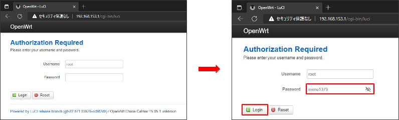 Microsoft Edgeで、「192.168.153.1/cgi-bin/luci」へアクセス