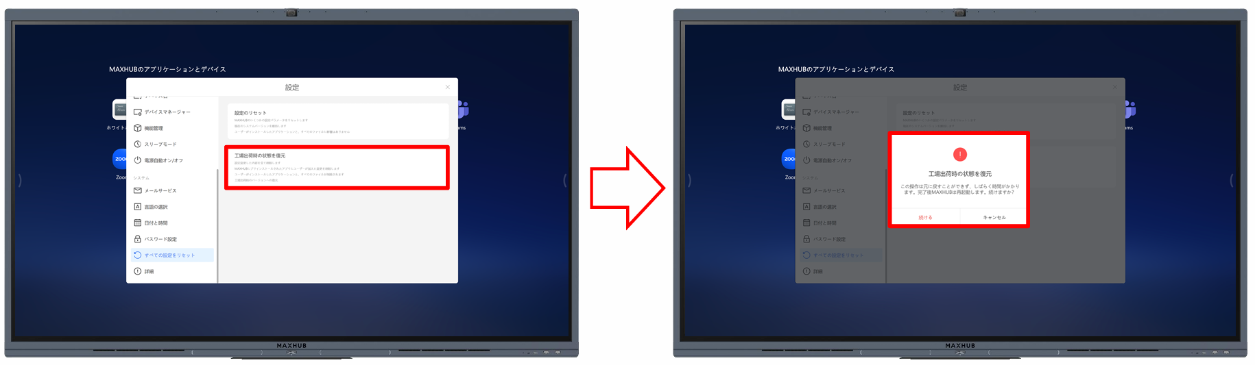 1.本体設定画面より、リカバリーを行います。 手順:ホーム画面>全てのアプリor アプリ一覧>設定>全ての設定をリセット >工場出荷時の状態を復元