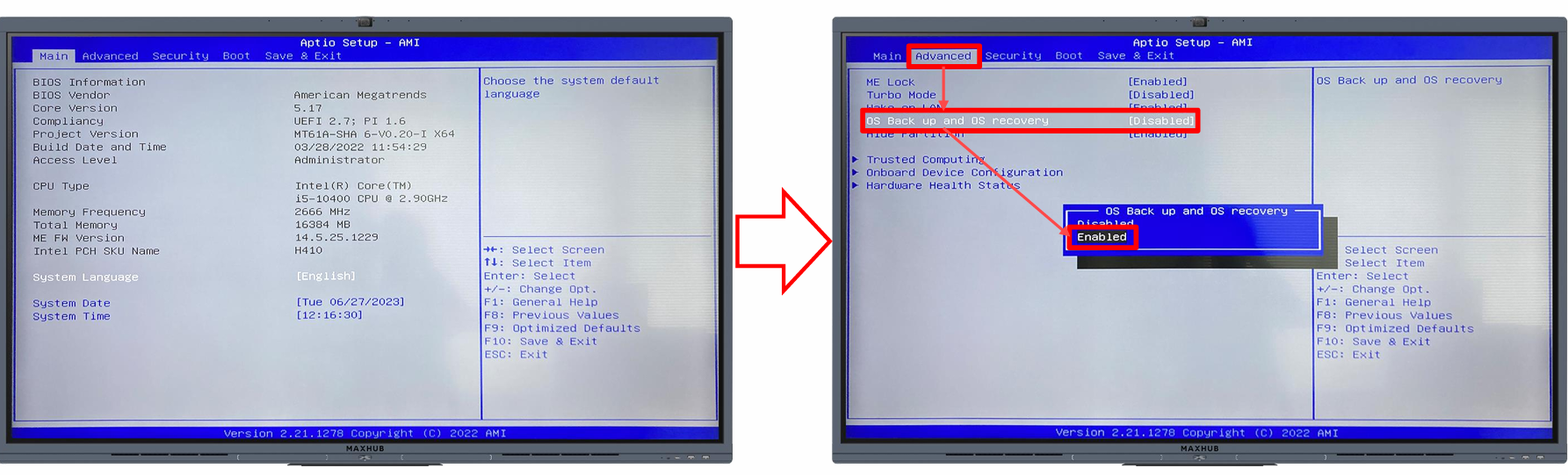 4.BIOS画面の表示後、キーボードにて以下の操作を実施します。 ①「→」キーを押して、「Advanced」へ移動します。 ②「↓」キーを押して、「OS Back up and OS recovery」に合わせ、「Enter」キーを押し、「Enabled」を選択します。
