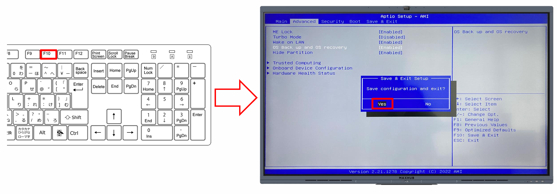 5.キーボードの「F10」キーを押し、「Yes」選択し「Enter」キーを押します。 本機が再起動されます。