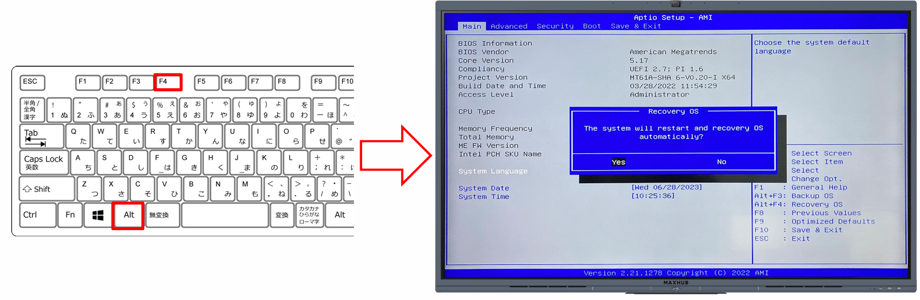 7.「Alt + F4」キーを押し、「Yes」を選択し、「Enter」キーを押すとリカバリーが開始されます。