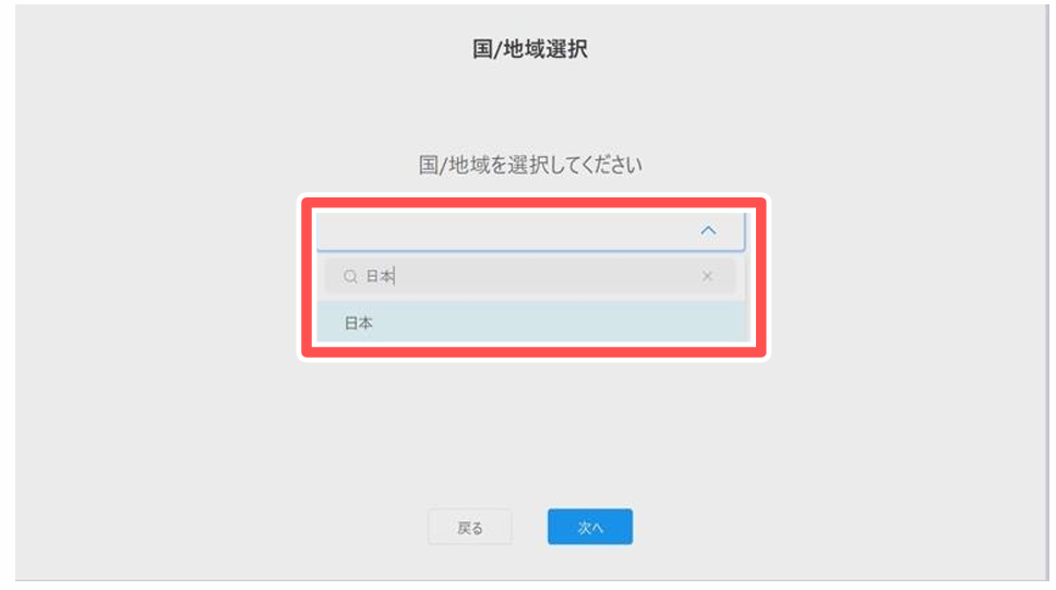 ご使用地域(例:日本)を選択後、「次へ」を押してください。