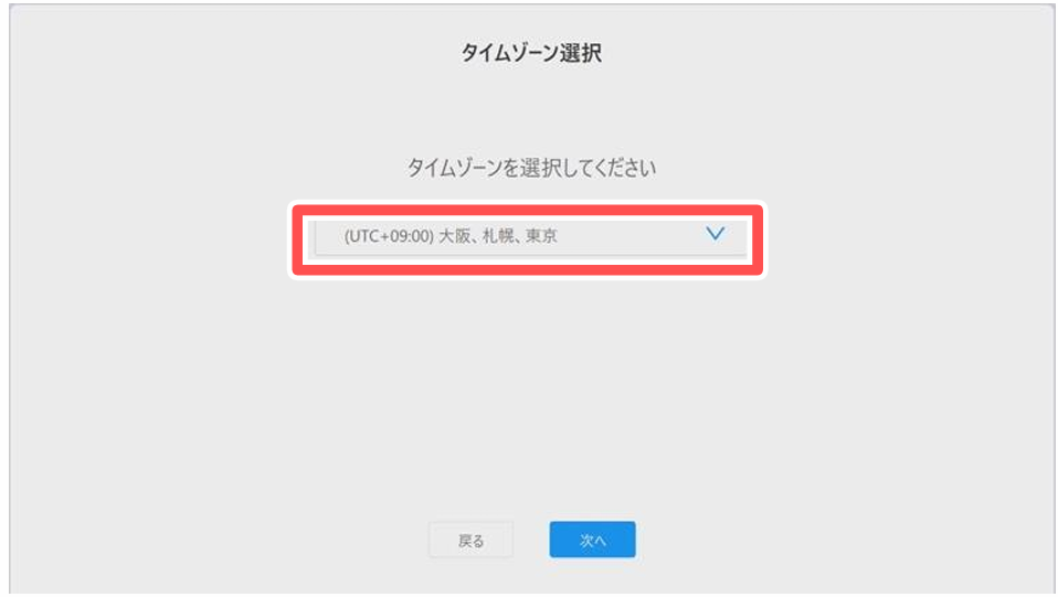 プルダウンで、ご使用される地域の時刻(例:大阪、札幌、東京)を 選択後、『次へ』を押してください。
