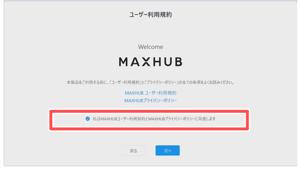 『ユーザー利用規約』と『プライバシーポリシー』をご一読いただき、 『同意します』のチェックボックスにチェックを入れ、『次へ』を押してください。