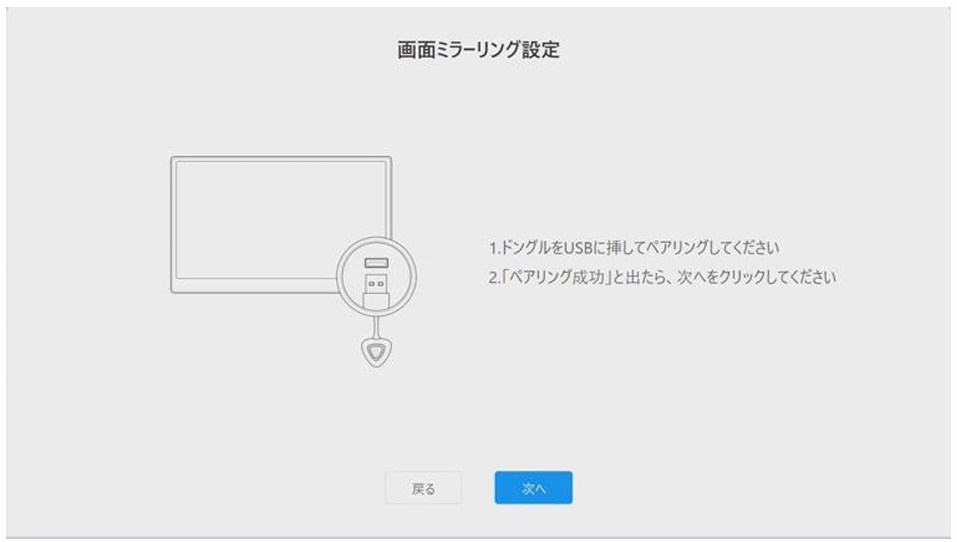 本体右下の USBポートにワイヤレスドングルを挿し、ペアリングを行います。 『ペアリング成功』と表示されたら、ワイヤレスドングルを抜き、 『次へ』を押してください。