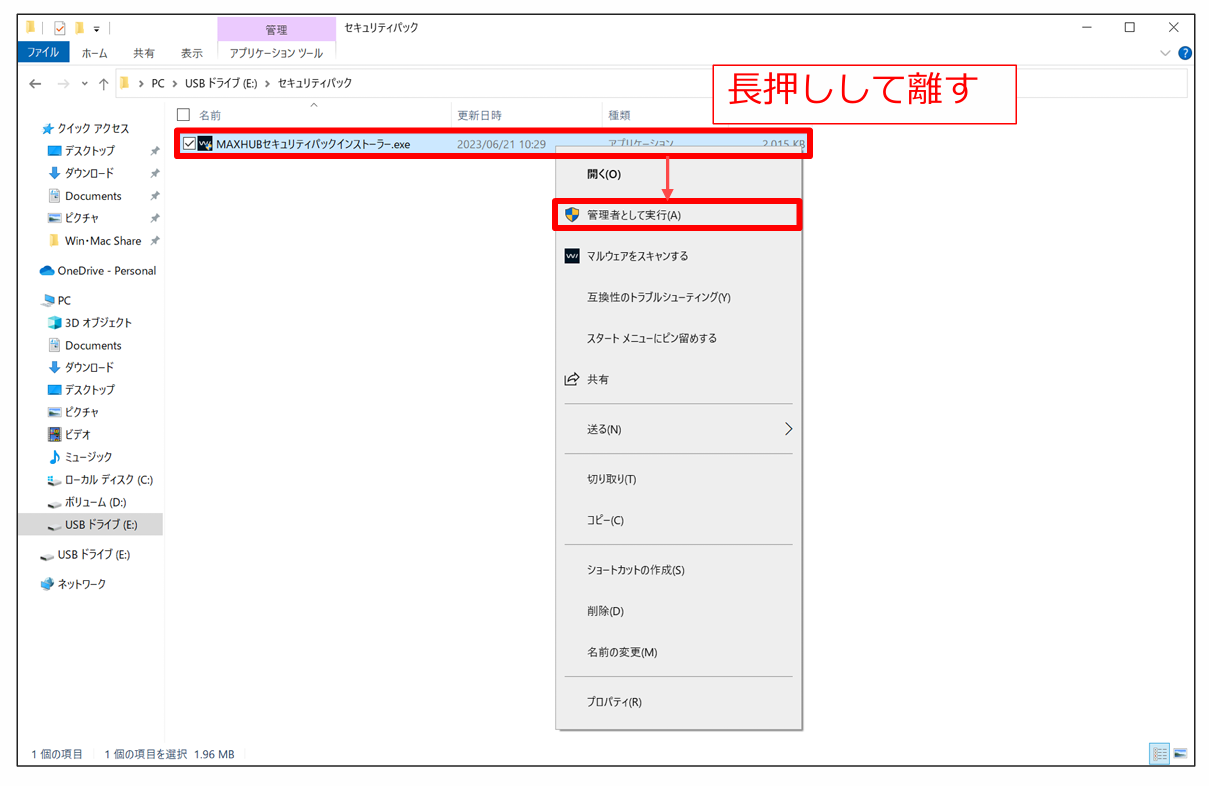 MAXHUBセキュリティパックインストーラー.exeを「管理者として実行」でインストールします。