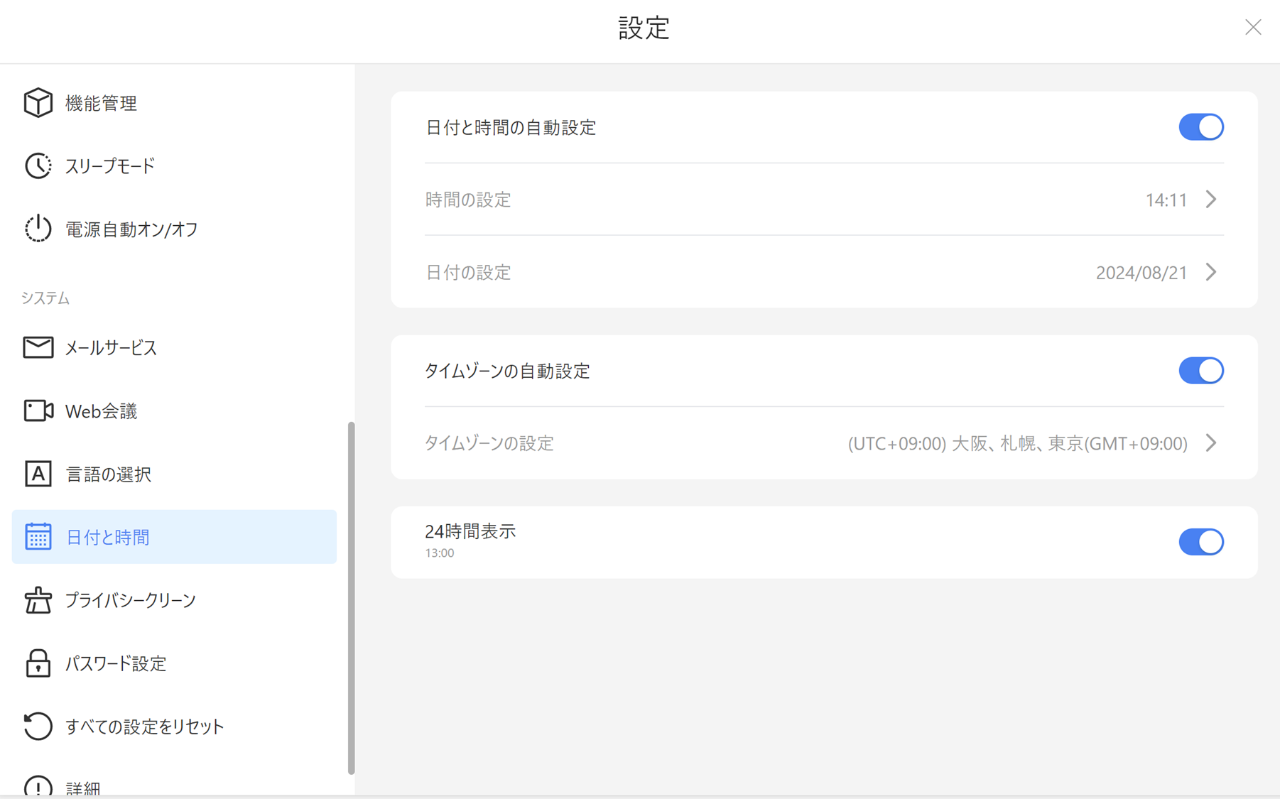 日付と時間の自動設定や手動設定、タイムゾーンの変更が可能です。