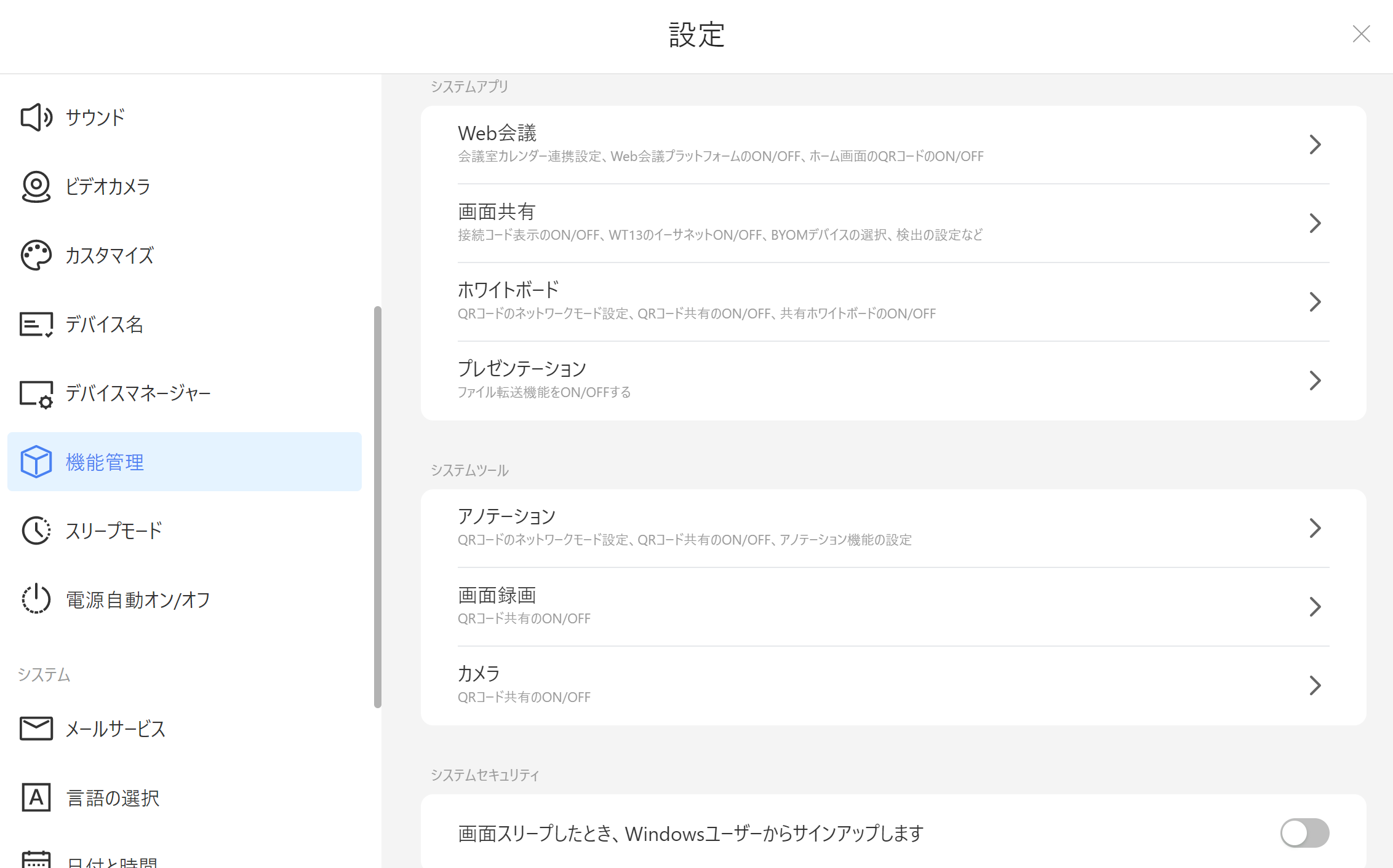 各種アプリケーション・会議カレンダーアカウント・システムに関する設定を変更できます。