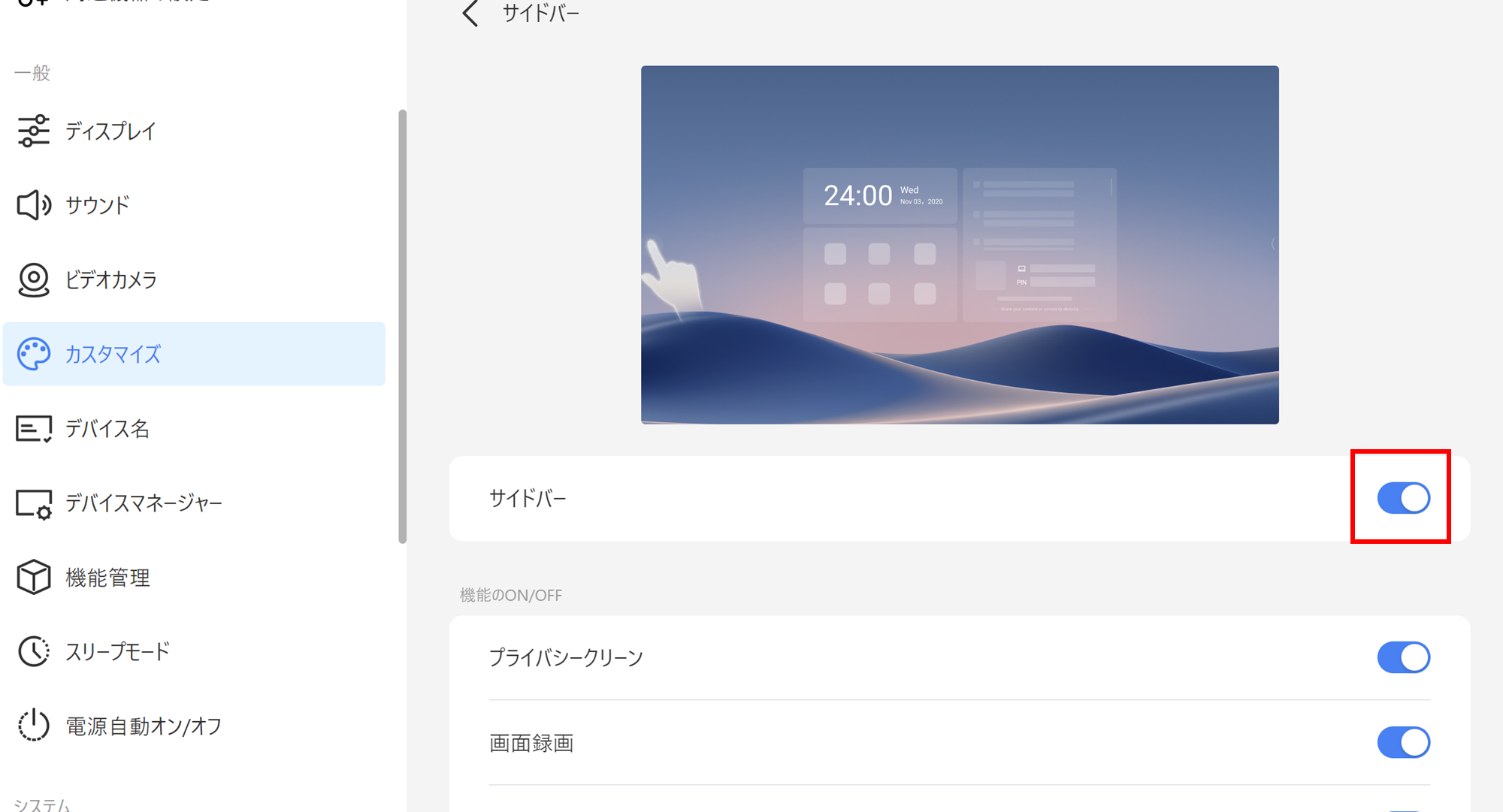 サイドバーの画面分割機能で表示させるプリセットを設定することができます。