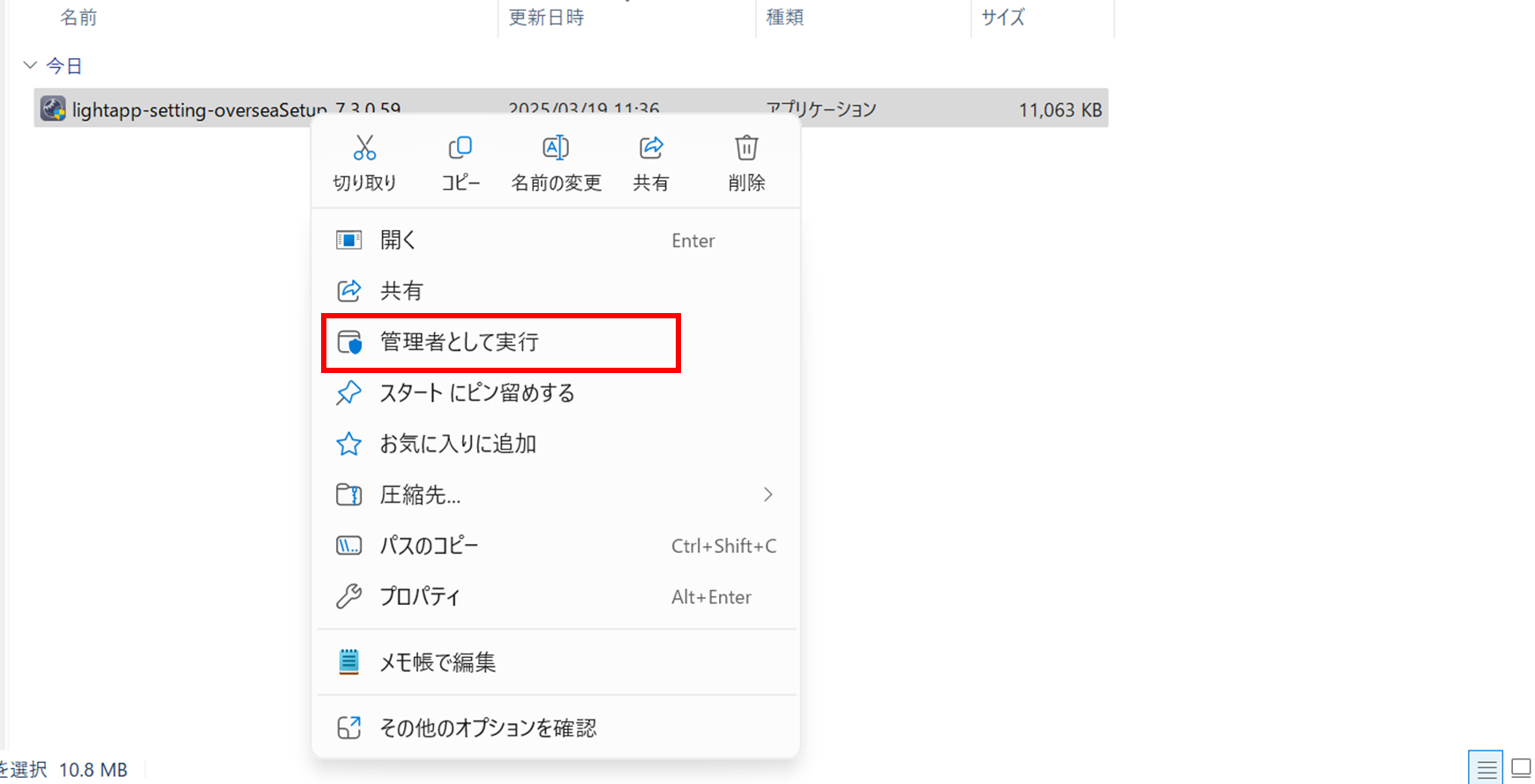 lightapp-setting-overseaSetup_7.3.0.59を長押し(右クリック)して「管理者として実行」をタップします。
