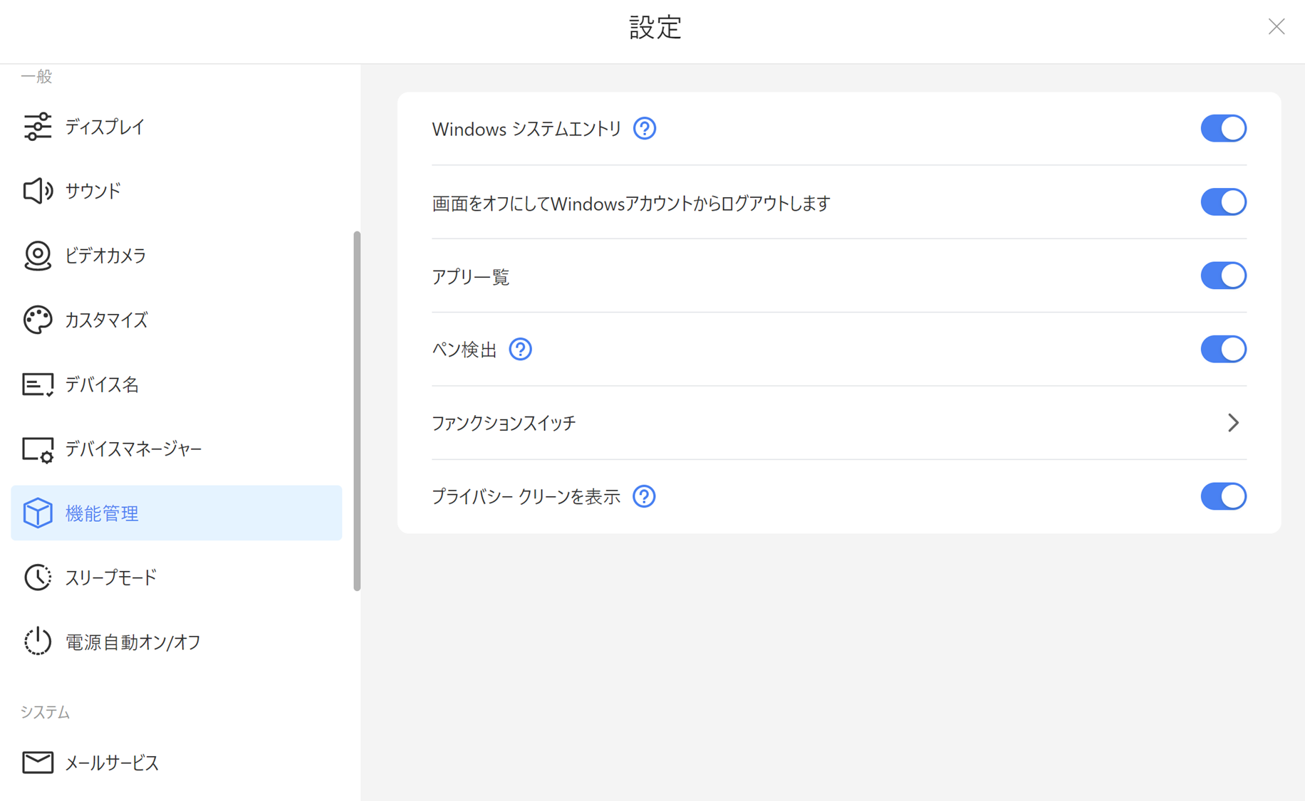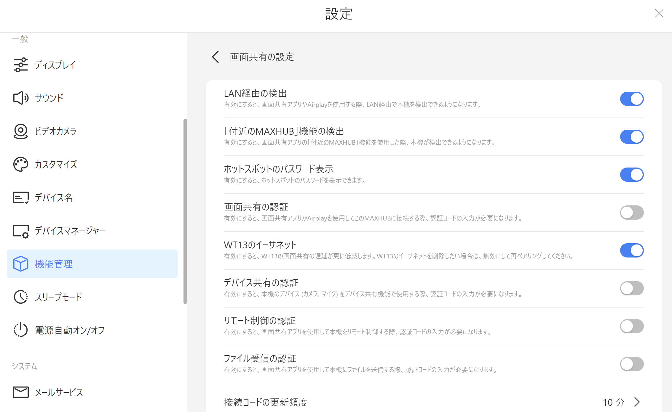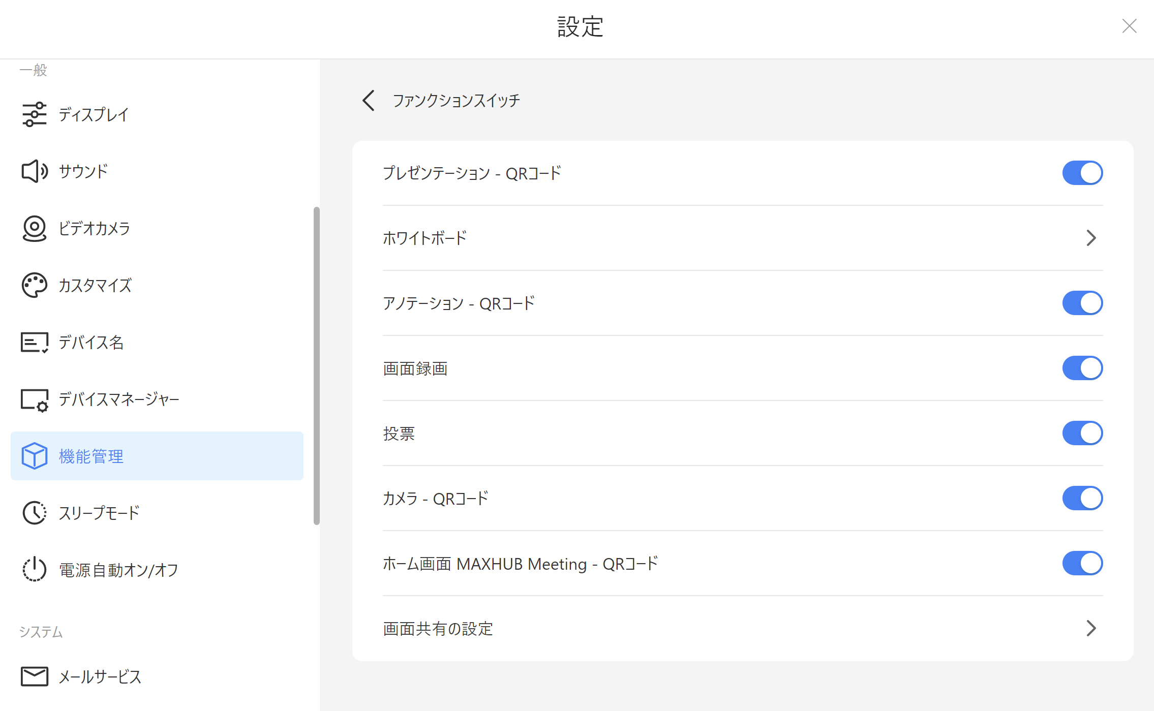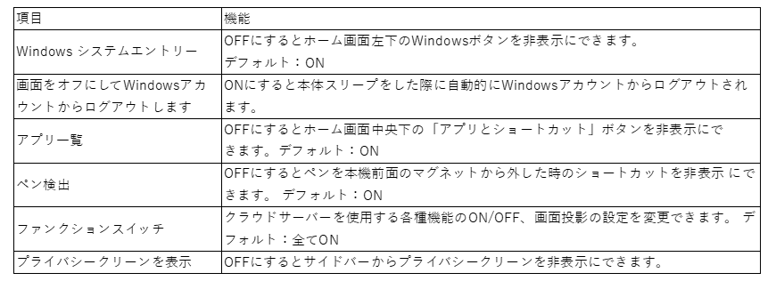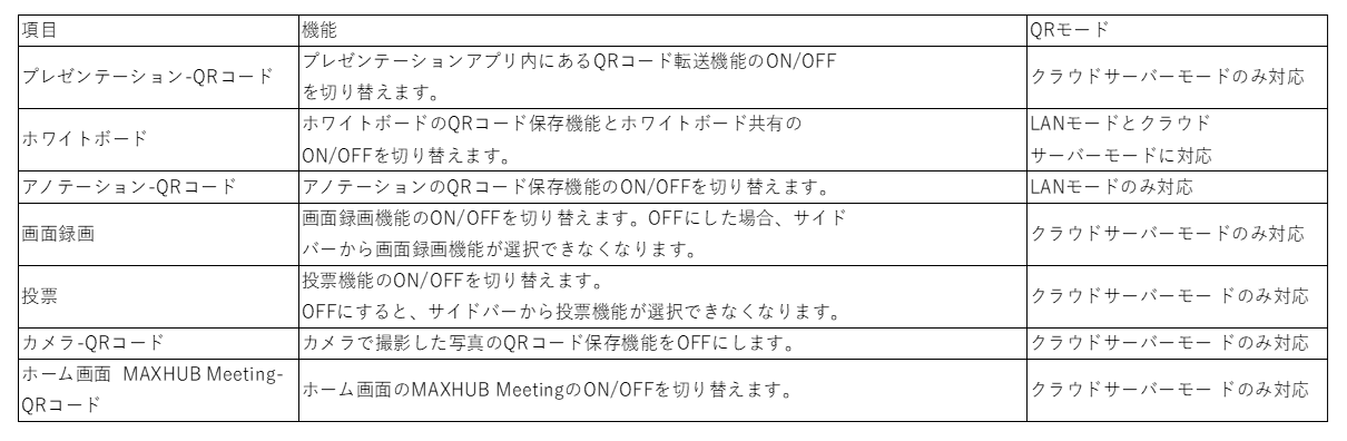 クラウドサーバーを利用した機能や画面投影に関する設定の変更ができます。 下記の機能の一部は各モードにそれぞれ対応しています。