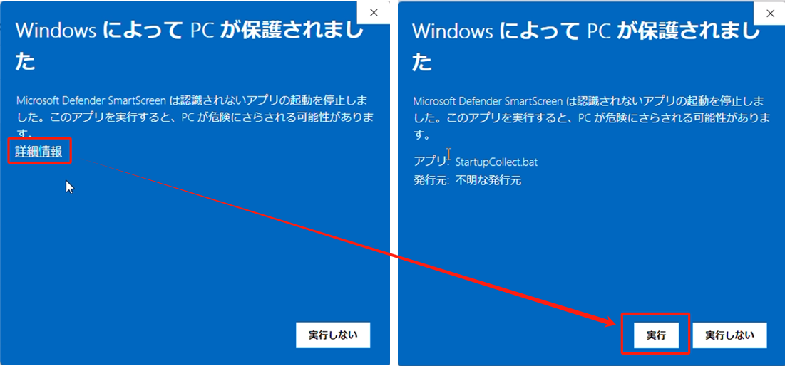 Windows によってPCが保護されました。の表示が出た場合は、「詳細情報」➾「実行」を選択してください。