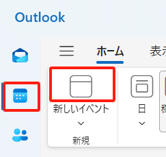 PCでOutlook クライアントアプリを開き、ナビゲーションバー > 予定表 > 新しいイベント作成アイコン を選択します。