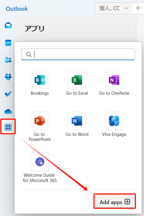 PCでOutlook クライアントアプリを開き、ナビゲーションバー > その他のアプリ > アプリの追加 を選択します。