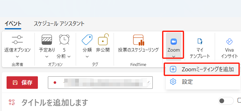 Zoom > Zoomミーティングを追加 を選択すると、ZoomのWeb会議のURLが作成されます。