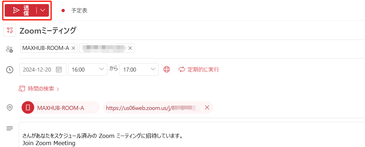 出席者にMAXHUBと連携したリソースアカウントと招待したい参加者のメールアドレスを追加し、開催時間を設定します。