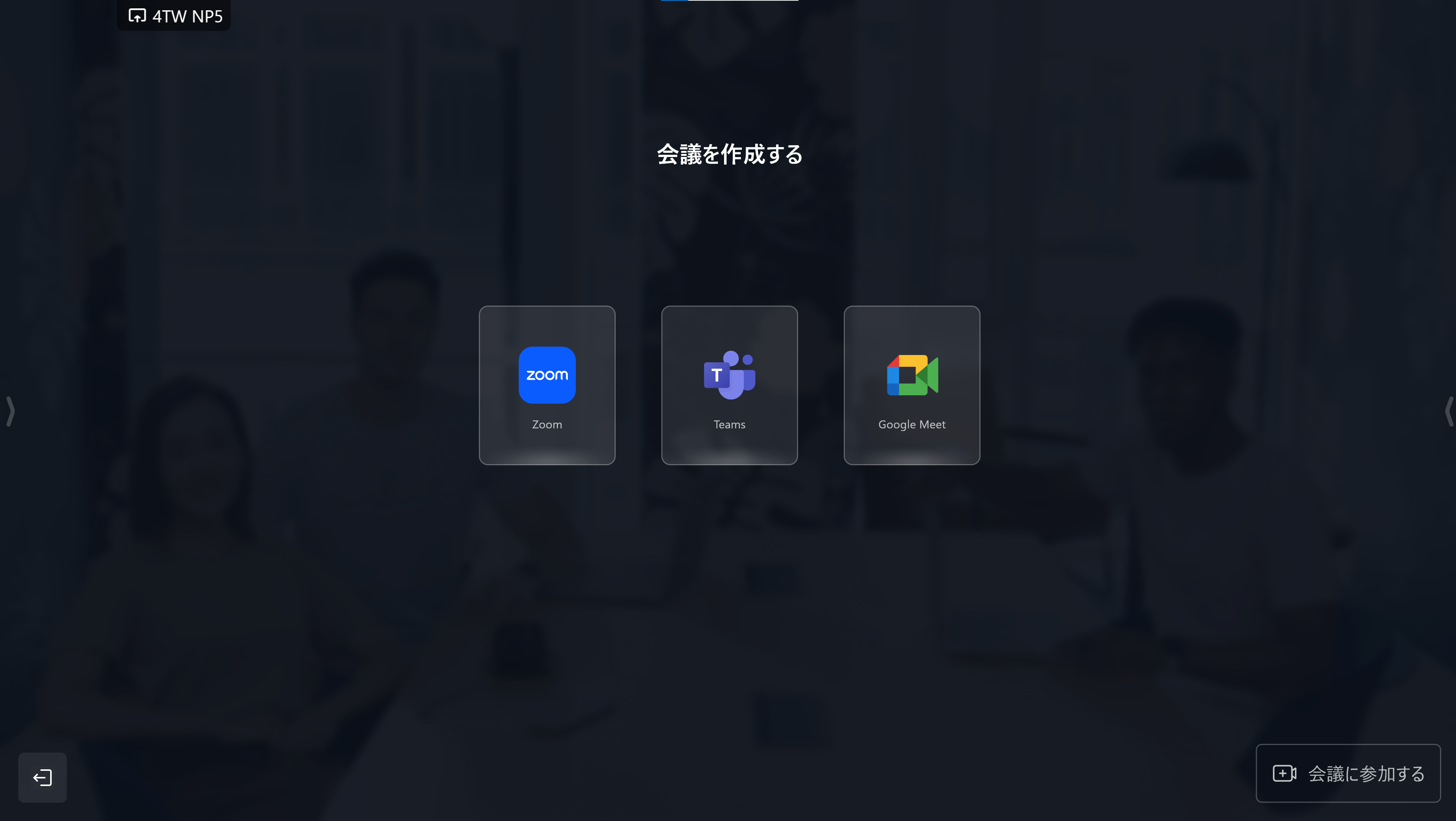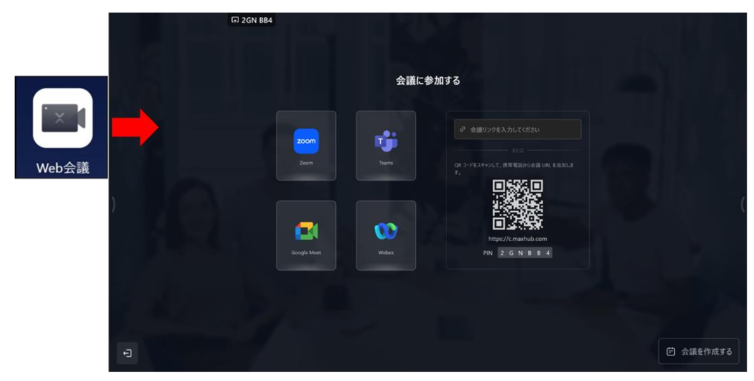 ホーム画面のWEB会議アプリを起動すると、Zoom・ Teams・Google Meet・Webexのアプリで会議を開始できます。 Zoom・Microsoft Teams はアカウント連携に対応しており、設定画面から事前に登録しておいたアカウントに紐づいて 会議を開始できます。