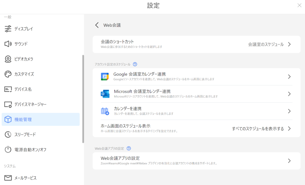 OutlookやGoogleの会議室リソースアカウントを本機に連携すると、 本機のホーム画面にWEB会議情報の予定表が表示され、 ワンタップでWEB会議に参加できる便利な機能です。