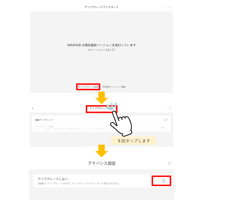 2)アップグレード設定をタップし、「アップグレード設定」の文字を8回タップします。
