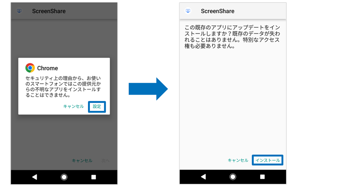 備考3:Android端末は、アプリのインストール時に下記の通り許可設定を行う必要がある場合があります。 ダウンロード後、インストールを実行すると、「不明なアプリをインストールすることはできません。」と表示されるた め、「設定」を押したあとインストールを押します。