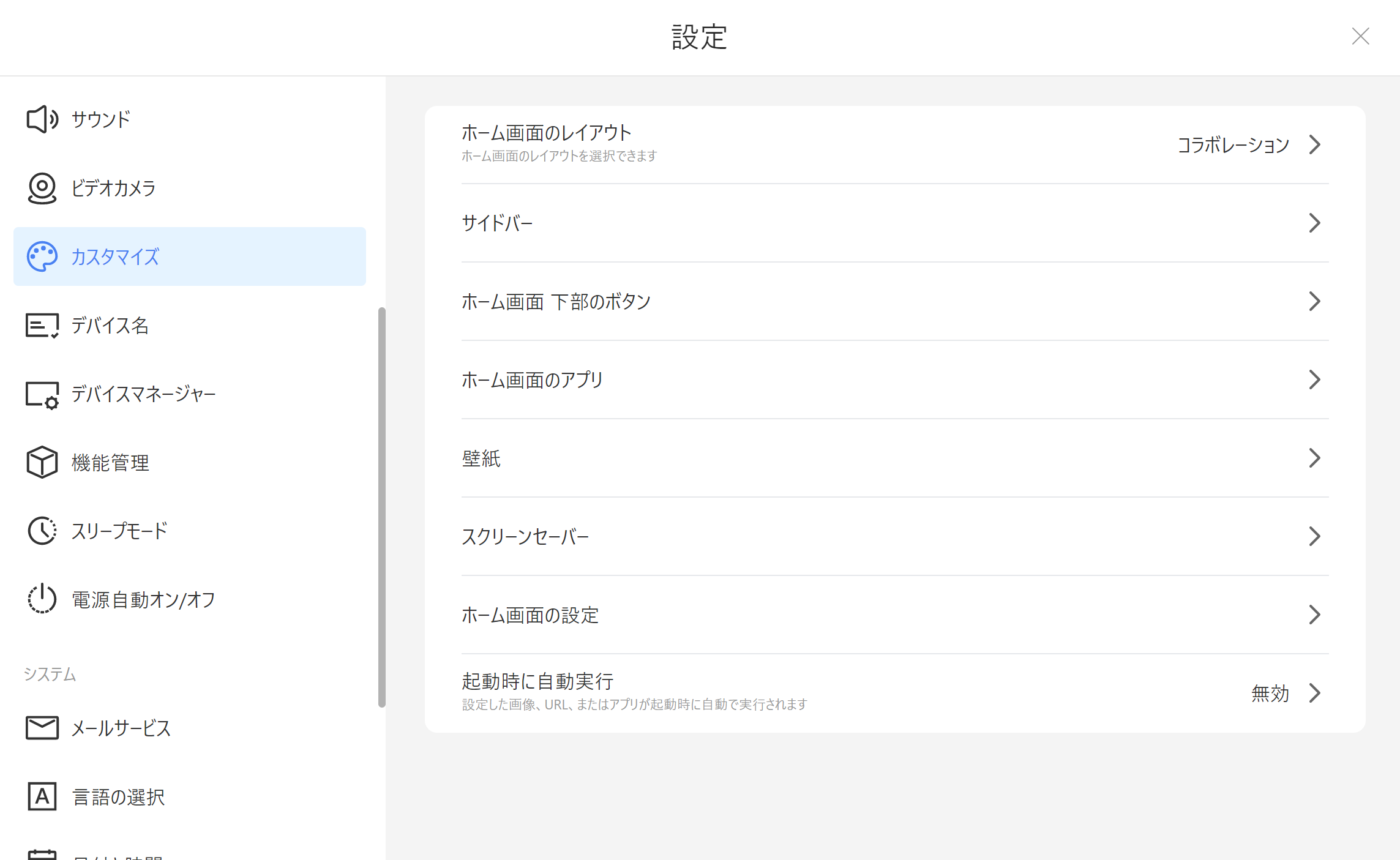 設定した画像、URL、またはアプリを本体の起動時に自動で実行します。