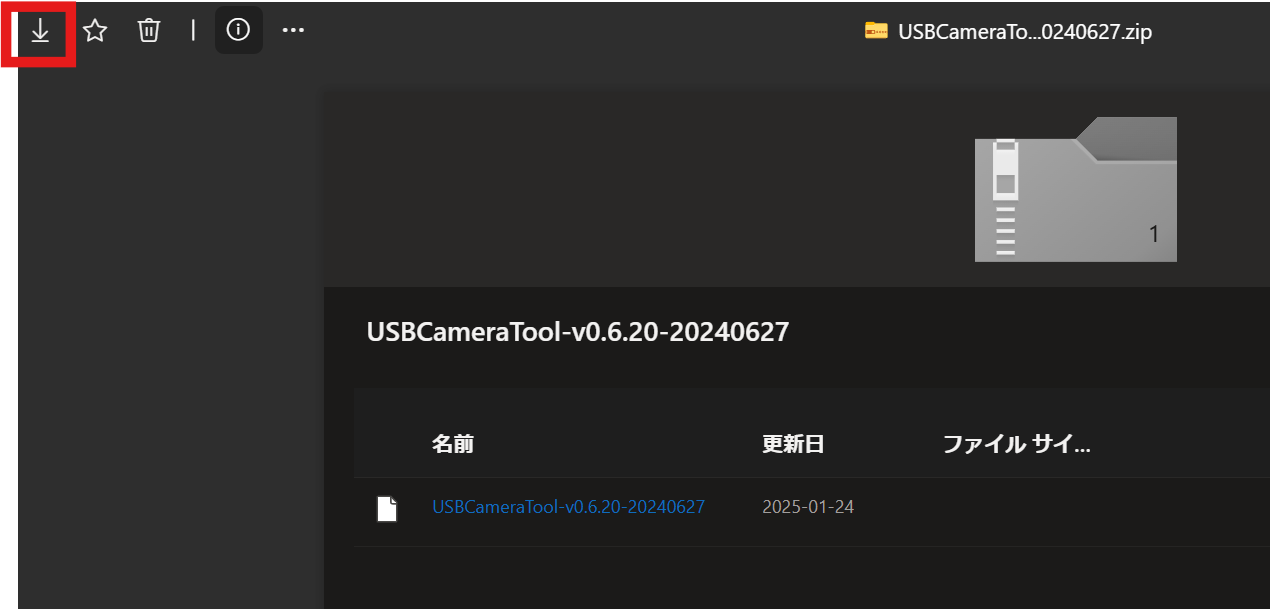 1.下記URLにアクセスし、↓アイコンをクリックしてUSBCameraTool-v0.6.20-20240627.zipをダウンロードします。USBCameraTool-v0.6.20-20240627.zip