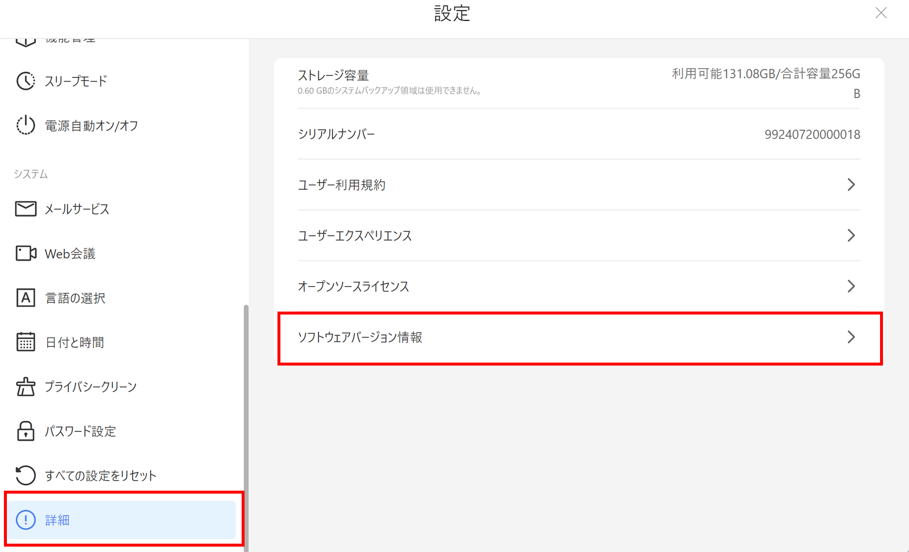 詳細>ソフトウェアバージョン情報へ進みます。