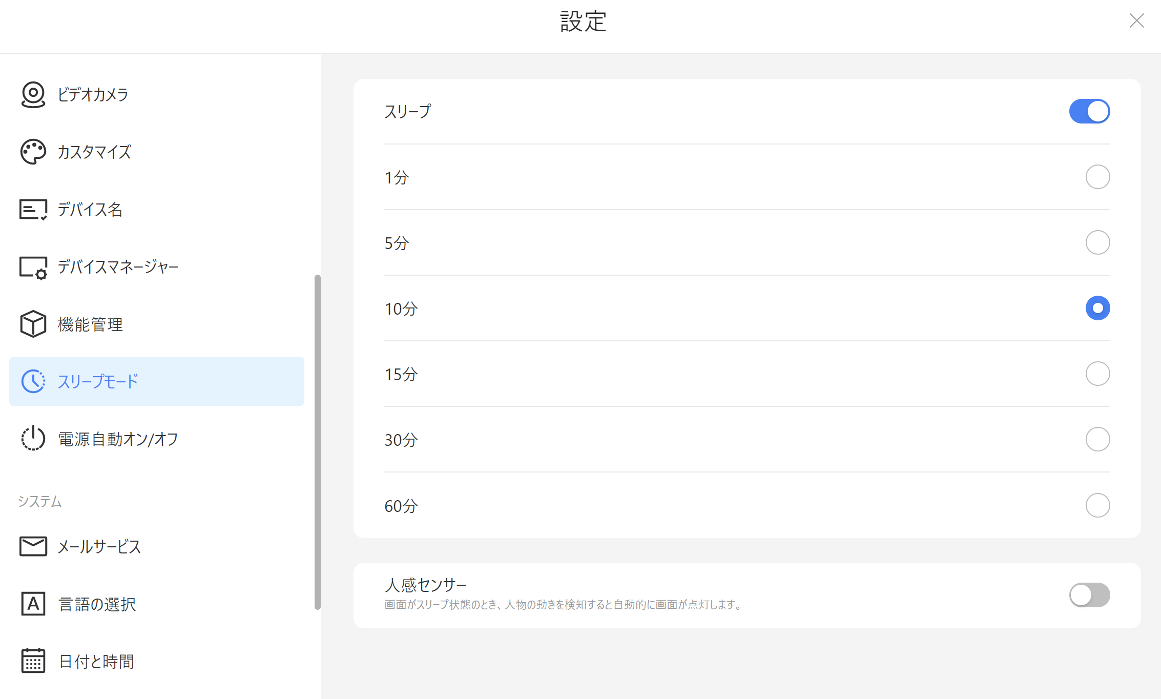 スリープスリープモードのオン/オフの設定ができます。オンにすると一定時間操作されなかった場合にスリープモードに移行できます。スリープ機能が有効になるまでの待機時間は、1分から60分まで設定できます。人感センサー人感センサーのオン/オフの設定ができます。オンにすると、ディスプレイの前で動きが検知された際に、自動的にスリープモードを解除できます。